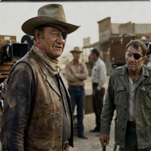 He steps closer. Once, twice, he removes his prop eye patch. The fake one exposes both eyes. He stares into Carl’s one remaining eye. The silence stretches. 5 seconds. 10. The boom operator shifts weight. The director opens his mouth, closes it. Wayne’s hands rest at his sides, then curl into fists, then release. He speaks once. Come.