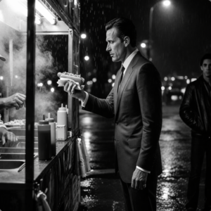 Beside him, two shadows in leather jackets, eyes scanning the dark like sharks. Give me one all the way. Mustard, onions, no sauerkraut,” the man says. His voice is like gravel wrapped in silk. S works fast. He’s served thousands. He hands over the hot dog wrapped in a thin napkin. The man takes a bite, stands there in the rain, and for a second the world stops.