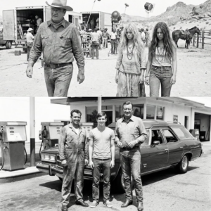 They look around, overwhelmed. This is a real film production. Big, professional, intimidating. Wayne starts walking toward the production office. The girls follow. People stare, whisper. John Wayne just arrived with two hippie girls. Long hair, beaded necklaces, dirty clothes. Nobody says anything, but everyone’s watching.