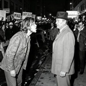 May 18th, 1968. The year America tore itself apart. Sirens wail through New York streets like wounded animals. Protest signs wave above angry crowds like battle flags. The air thick with tear gas and revolution. This is the night John Wayne discovered that true strength isn’t about fighting back.