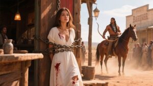 fue encadenada frente a la cantina hasta que un guerrero comanche la llamó suya. Al atardecer, el cielo sobre el río Bravo ardía como una herida abierta, tiñiendo el agua de rojo y naranja intenso que parecía palpitar con historias antiguas, mientras una bruma cálida transportaba olor a ceniza, madera quemada y secretos susurrados.
