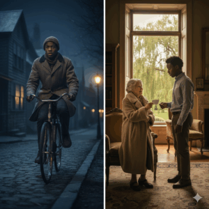 Al instante, el corazón de Andre se hundió y se elevó a la vez. Oak Hill. Lo sabía. Estaba en las afueras, a casi dos horas de distancia en bicicleta, y gran parte del camino era cuesta arriba. La decisión era clara: dos horas de esfuerzo físico extenuante, la pérdida garantizada de su techo, o abandonar a una mujer vulnerable a su suerte. Andre, con una convicción que solo la bondad genuina puede inspirar, eligió el camino más difícil. Forzó una sonrisa, ató su bufanda de repuesto al portaequipajes para amortiguar el asiento y le envolvió los hombros con su propia chaqueta gastada.
