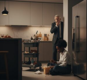 El llanto se hacía más nítido con cada escalón. Venía de la cocina. Cuando empujó la puerta, la escena frente al congeló el aire en sus pulmones. Sentada en el suelo frío, apoyada contra los armarios blancos, estaba Beatriz, su empleada doméstica. Tenía el rostro escondido entre las manos, los hombros temblaban.