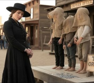 No había planeado detenerse. No necesitaba pan. No necesitaba clavos. No necesitaba nada. En realidad, ya no. Pero algo en la forma en que el viento cambiaba la hizo tirar de la carreta hacia la plaza. Fue entonces cuando los vio. Tres niños, con sacos atados a la cabeza como máscaras de arpillera, las manos atadas a la espalda, inmóviles junto a un cartel pintado a mano que decía: “Huérfanos, 3 dólares cada uno. Hermana, sin nombres, sin edades, solo eso”. Martha Langley bajó de su carreta, con las botas golpeando la tierra como un desafío. Al principio, nadie se dio cuenta. Nadie lo hacía nunca. Hacía tiempo que al pueblo le había dejado de importar adónde iba la viuda Langley ni por qué.