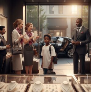 El ruido de las carcajadas cortó el aire de la joyería como una hoja afilada. Tres mujeres elegantemente vestidas señalaban al joven de 17 años que acababa de entrar en la tienda, sus risas resonando entre los escaparates de cristal y las joyas brillantes.