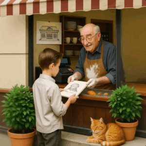 I swallowed hard, then pulled out the only thing I had—a small, worn-out sketchbook. I opened it to a page I’d filled the week before: his bakery, with its striped awning, the potted plants by the door, and the orange cat that always slept on the front step.