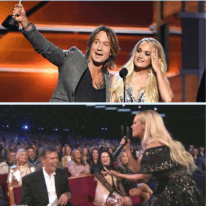 As Carrie sang, the audience erupted when Randy Travis himself walked onto the stage. Fans jumped to their feet, giving the country icon a thunderous standing ovation. Carrie, clearly stunned, froze mid-performance as she took in the moment.