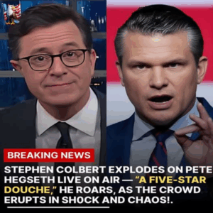 The studio froze. Hegseth, momentarily speechless, struggled to respond. The audience erupted into a mix of laughter, gasps, and shocked murmurs. Cameras captured Colbert’s piercing gaze as he delivered the line with surgical precision, turning a routine interview into pure television chaos.