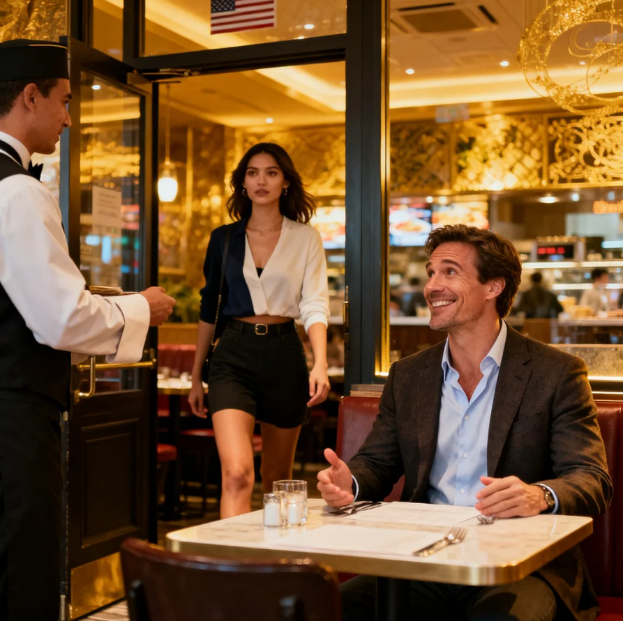 The hostess greeted him with a warm professional smile. “Good evening, sir. Do you have a reservation?” “Meeting someone actually,” Hunter said, rubbing the back of his neck. “Blind date.” “Her name’s Megan, blonde, around 30.” “Of course. Right this way.” She led him through the warm glow of the restaurant to a table near the window where amber evening lights spilled across crisp white tablecloths like liquid gold.