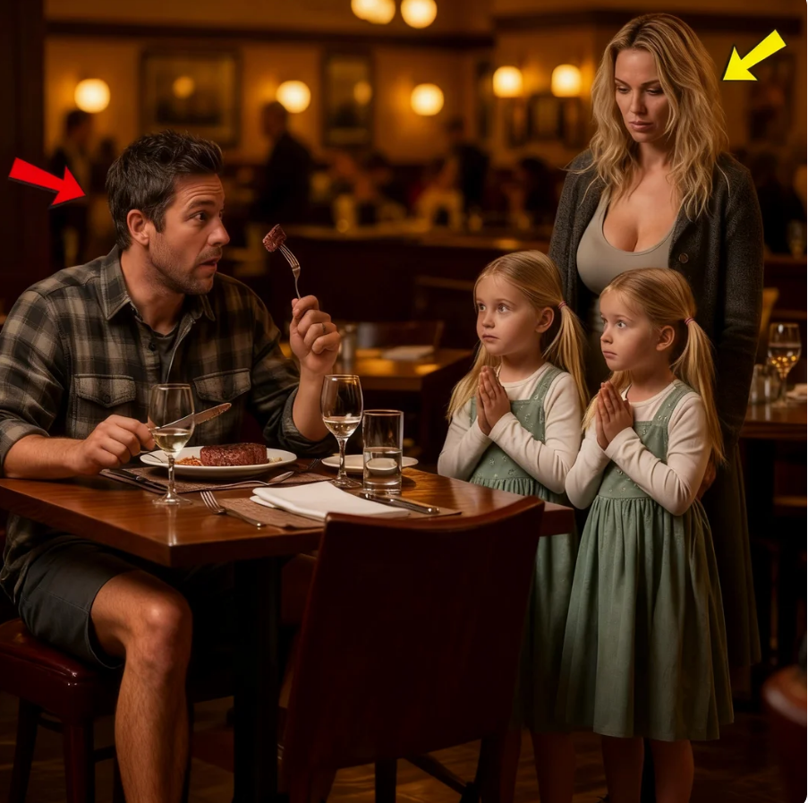The steakhouse was buzzing with laughter, silverware clinking against plates, and the low hum of business chatter. Daniel Hayes, a single dad in his 30s, was halfway through a modest dinner with his son when he heard it, a soft, trembling voice at his elbow. Sir, may we have your leftovers? He turned, startled, to see two identical little girls, no older than seven, their dresses wrinkled, cheeks hollow from hunger, but their eyes bright with something that cut him deeper than pity. Hope.