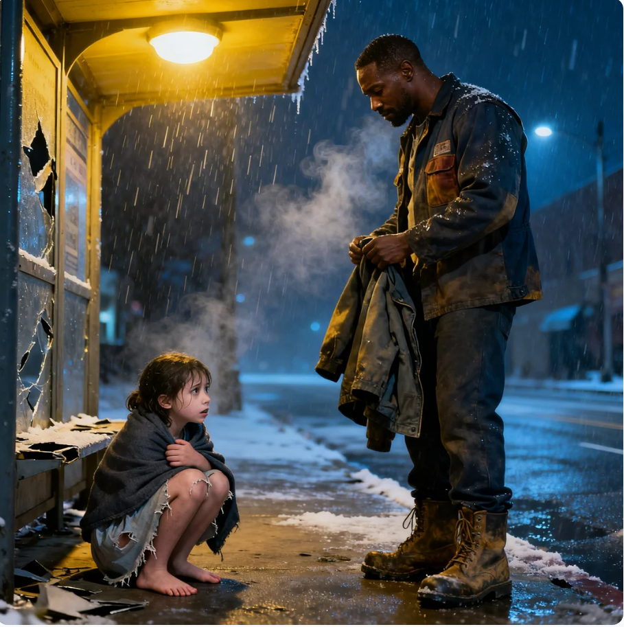His worn boots splashed in shallow puddles and his breath curled in pale clouds in the freezing air. But then, just as he turned the corner toward his small apartment building, he saw her. A little girl, no older than eight, crouched under a broken bus stop shelter. She had no coat, just a thin tattered dress clinging to her tiny frame.