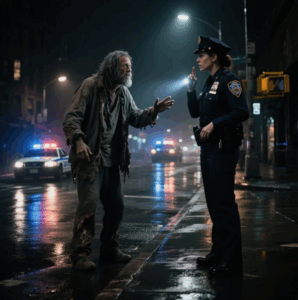 The rain fell in relentless sheets, washing the city in a blur of neon and darkness. Officer Rachel Taus pulled her patrol car to a slow stop at the edge of the alley. Something—or someone—caught her eye. A man, hunched against the damp brick wall, barely visible in the drizzle. At first glance, he was nothing extraordinary: unkempt hair plastered to his scalp, beard thick and tangled, clothes threadbare and soaked. Just another forgotten soul swallowed by the city’s shadows.