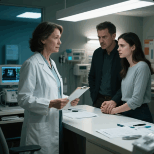 I hid behind my nurse coordinator desk, clutching a patient file, watching him. He was holding the hand of a blonde woman, younger than him, her eyes swollen from endless crying.