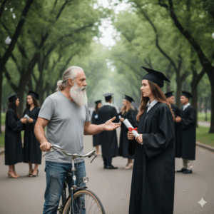 I stood there in my cap and gown while my classmates’ parents snapped photos with their expensive cameras. Frank showed up late, as usual. He had done his best—his beard was combed, his only decent jeans were clean, and he wore a faded button-up shirt. But his tattoos peeked out from his sleeves—faded skulls, flames, and a big eagle stretched across one arm.