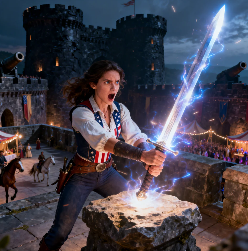 The warmth started in her palm and poured up her arm and into her chest and settled behind her ribs like a second heartbeat, and the sword slid from the stone as if the stone had never been holding it at all. That underwater bell sound, clear and resonant and impossible. Silence. Aaron stood with the sword in her hand and her heart in her throat and the warmth still spreading through her like sunlight filling a room and every pair of eyes on the ceremonial terrace turned toward her.