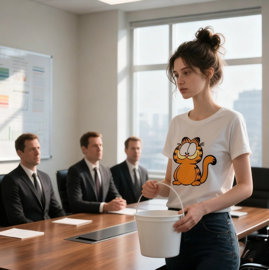 At that exact moment, the door creaked open. In walked a woman pushing a mop bucket, wearing faded jeans sneakers that had seen better days and a Garfield t-shirt that read, “I’m only awake because coffee exists.” Rachel Evans hadn’t expected to be called in that morning. One of the associates had knocked over a glass of water during the chaos.