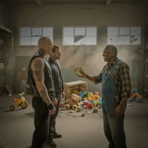 Jake Morrison and his men roamed the aisles like soldiers on a mission. Leather jackets brushing against shelves of toys, tattoos glinting under fluorescent lights. Samuel pushed a cart filled with dolls, coloring books, and toy cars.