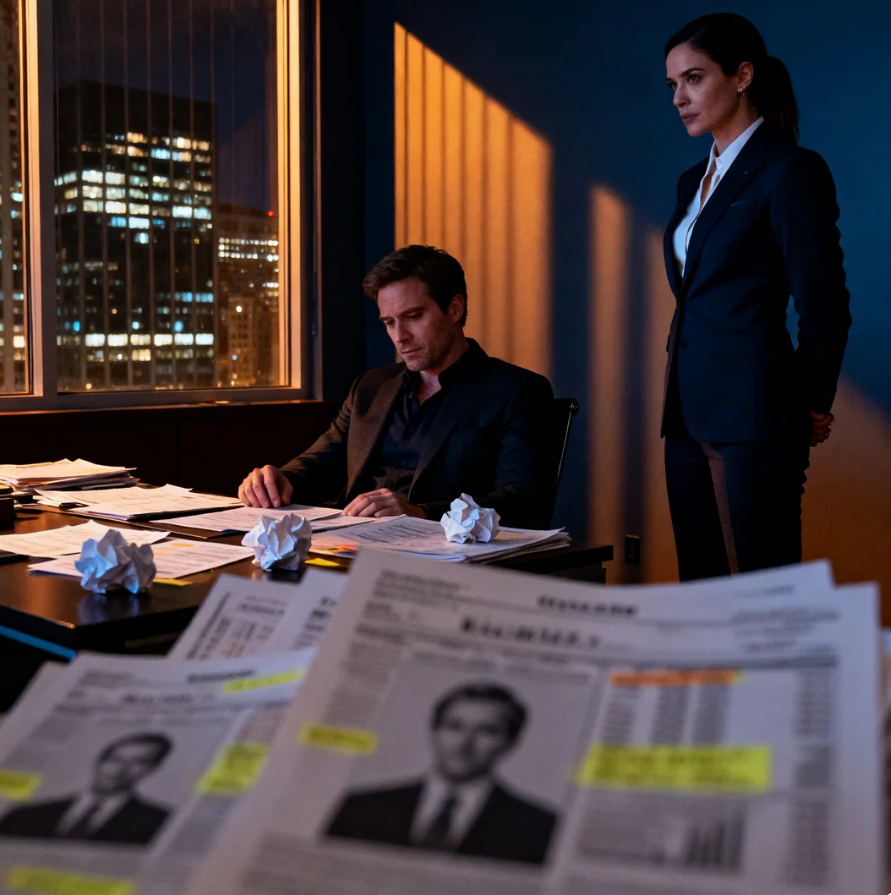 The city lights twinkled through the massive windows, and the building was so quiet he could hear his own heartbeat. Lux was already there, surrounded by stacks of financial reports, her jacket draped over the back of her chair and her sleeves rolled up like she was preparing for war. “Close the door,” she said without looking up.