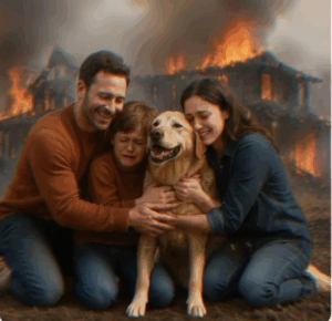 Jessica held Luke tightly, crying uncontrollably. Tom stood beside her, staring at the ruins of their home, unable to speak. Sam lay on the grass, gasping for breath, his fur blackened and his paws burned — but alive.