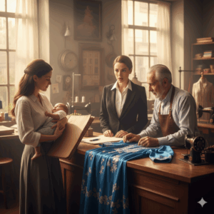 “Please, just look at my work,” I insisted, pulling out the dress I’d finished the night before—a blue silk gown with delicate flower embroidery along the neckline.