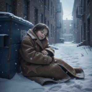 She was huddled beside a trash container, knees drawn to her chest, wearing a thin dress and shoes with holes in the soles. Her lips were blue, her hands trembling violently.