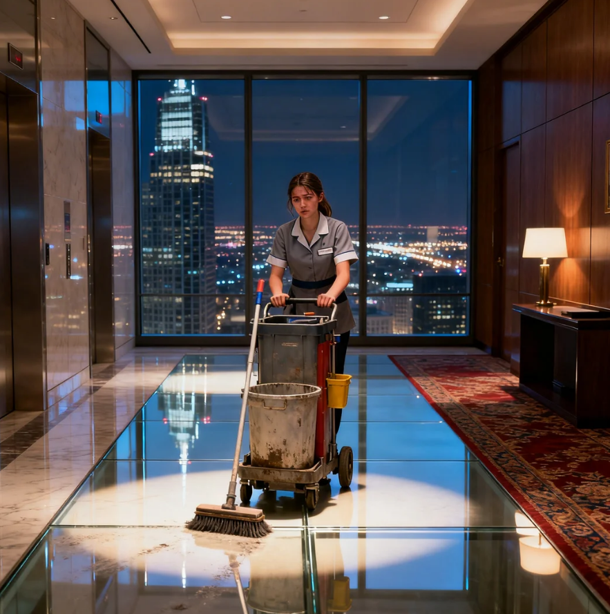 It was a glass skyscraper that pierced the clouds and housed some of the most powerful people in the country. By day, those halls were filled with men in tailored suits and women in heels sharp enough to be used as a weapon. But by night, the building belonged to her. She wiped fingerprints from glass desks, empty trash cans filled with half-finished coffees and shredded documents, and vacuumed carpets that cost more than her monthly pay.