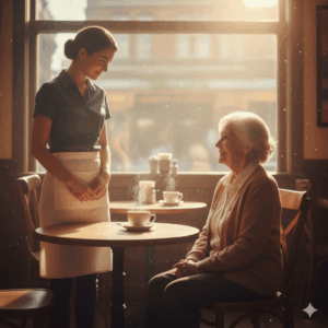This became our routine. Every Tuesday. Two coffees. Conversations with someone who wasn’t there. A shared meal she alone ate. I brought two plates, two sets of cutlery, filled both cups. Asked if “he” wanted extra napkins.
